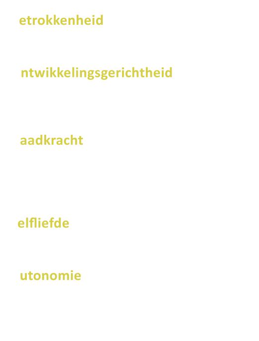Om mijn missie te realiseren ben ik voortdurend bezig om mijn eigen gedrag op de omgeving door te ontwikkelen. Ik werk vanuit de waarden respect, nieuwsgierigheid, kwaliteit, resultaatgerichtheid, liefde en transparantie.